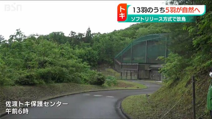 佐渡市の『トキ保護センター』で午前6時から始まったトキの放鳥は、飼育しているケージの扉をあらかじめ開けた状態で、トキが自然に飛び立つのを待つ「ソフトリリース方式」で行われています。