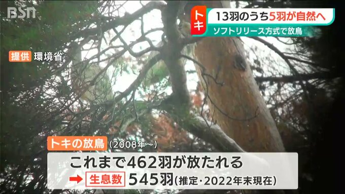 トキの野生復帰を目指した放鳥は2008年から実施され、これまでに462羽が自然界に放たれ野生下でも繁殖が進み、生息している数は推定で545羽となっています。