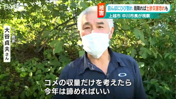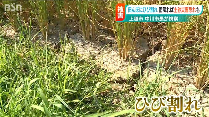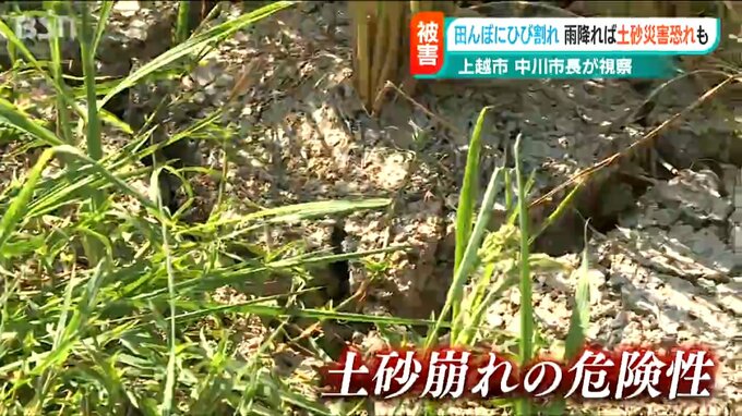 新潟県内では記録的な渇水により様々な農作物への被害が出ていますが、この状態で一気に雨が降ると土砂災害の恐れがあるとして、上越市の中川市長が農作物やひび割れた水田の被害状況を確認しました。