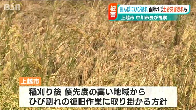 上越市は今後、中山間地の田んぼを中心にひび割れを調査して稲刈りの後に優先度の高い地域から復旧作業に取り掛かりたいとしています。