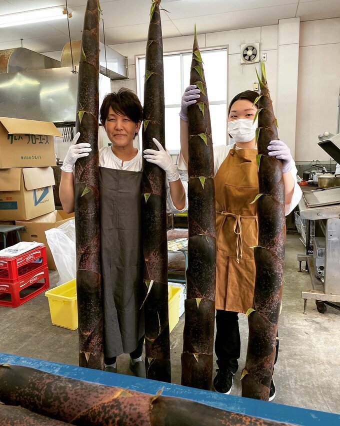 人の背丈を超える長さ約2mの幼竹を切り出し、ゆでた後に塩漬けにして発酵させます。商品化にあたり、どんな味付けがいいか、試作を重ねてきました。