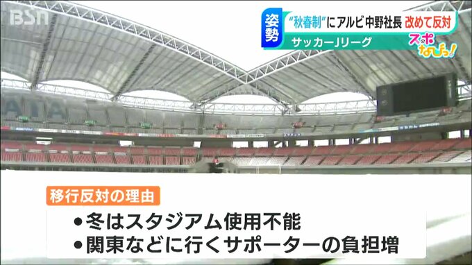 サッカー Jリーグで検討されている「秋春制」へのシーズン移行。Jリーグが導入を推進する立場を表明したことを受け、アルビレックス新潟の中野幸夫 社長は、改めて反対していく姿勢を示しました。