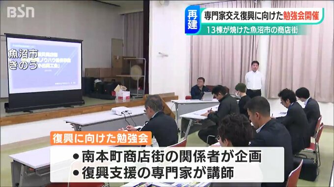 復旧後、商店街を活性化するためのポイントも紹介しました。勉強会ではこのほか、商店街再建のための資金調達などについて具体的な方法も説明。関係者からは、再建費用などについて質問がありました。