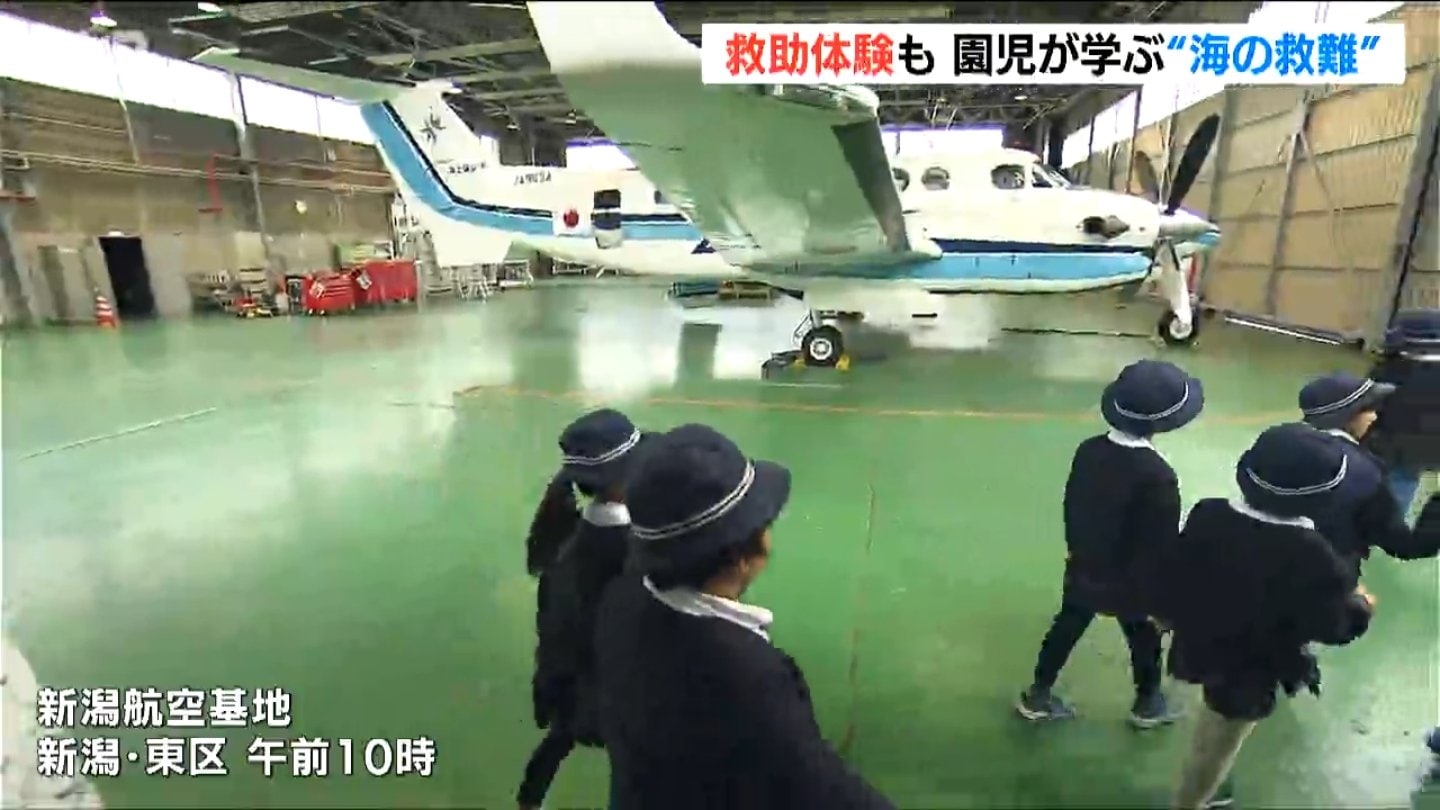 新潟市東区の中道山こども園の園児が30日午前、第9管区海上保安本部の「新潟航空基地」を訪れ、航空機を間近で見たり救助訓練を体験したりしました。