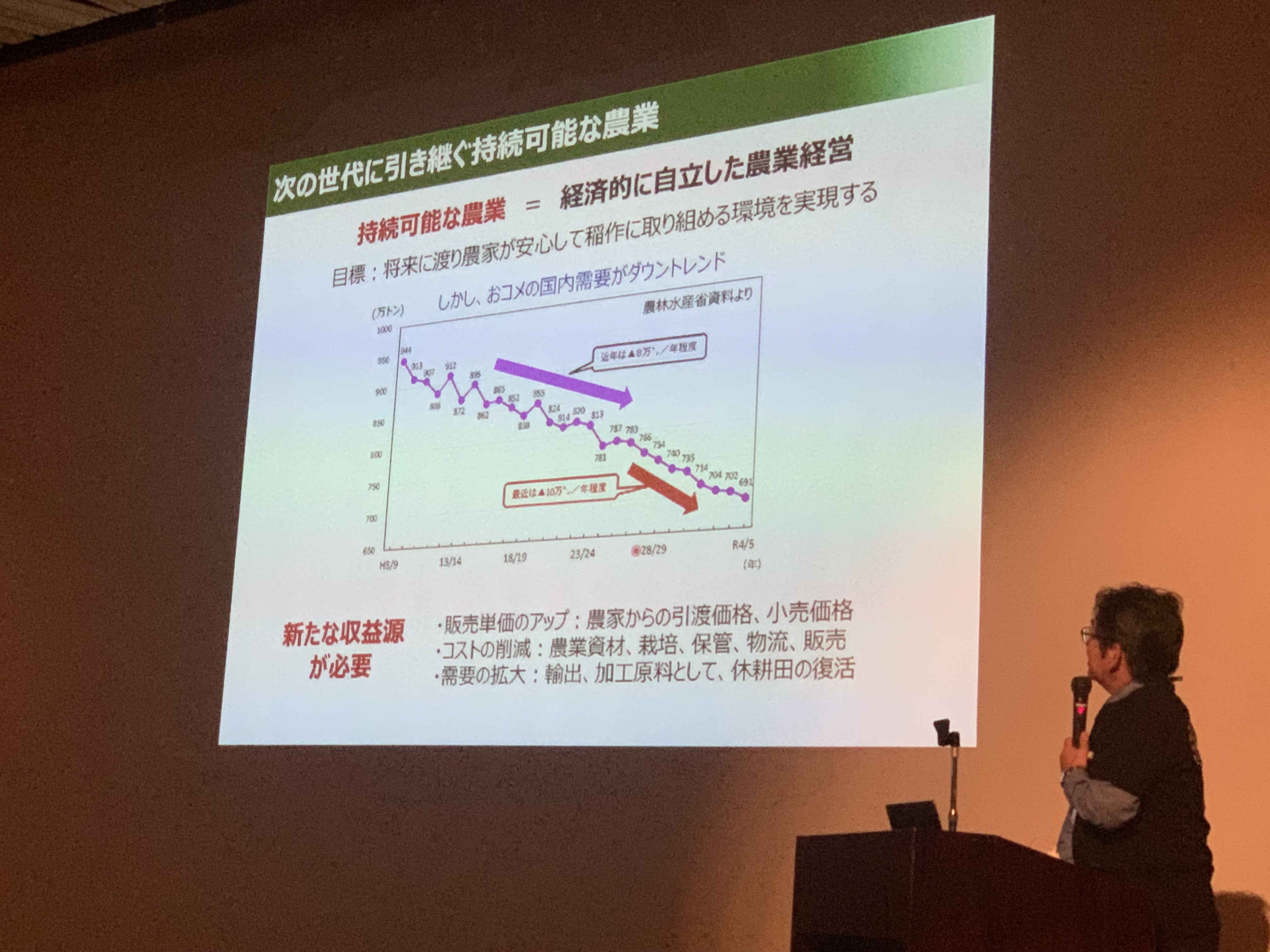 また、シンポジウムではJAえちご中越常務理事の難波英洋さんが長岡市の8月の平均気温が30.5℃と平年を4.3℃上回り、猛暑日が27日、熱帯夜が24日だったことを報告し、この影響で管内で今年収穫されたコシヒカリの1等米比率は1.2%と落ち込み、農家の収入が全体で30億7000万円減ったことなども報告されました。