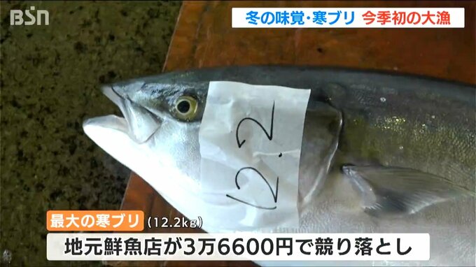 さっそく競りが行われ、最も大きかった12.2キロの寒ブリは地元の鮮魚店が3万6600円で競り落としました。
