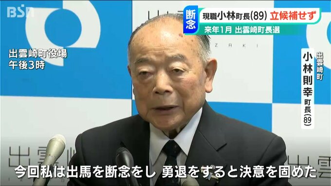 任期満了に伴い来年1月に予定されている新潟県 出雲崎 町長選挙で、10期目を目指し出馬を表明していた89歳の現職 小林則幸 町長が一転、出馬を取りやめました。「後継と三つ巴の戦いとなり、町政に混乱を招きたくない」としています。