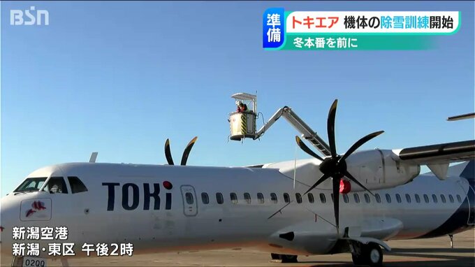 就航のめどを示していない新潟空港拠点の地域航空会社「トキエア」が本格的な冬の時期を前に22日から、機体の除雪作業の訓練を始めました。