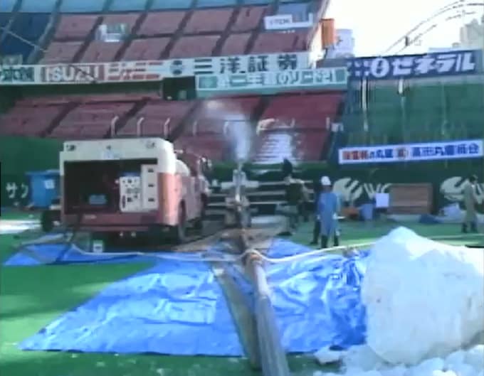 雪と水を混ぜてシャーベット状にし、それを観客席に噴き上げて消えるのを待つという方法です。