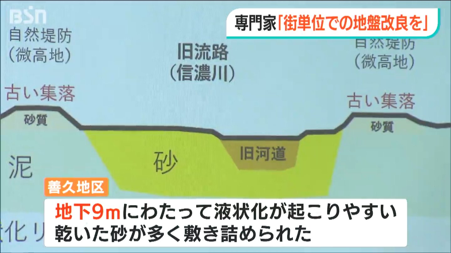 信濃川を埋め立てた際、地下9メートルに渡って液状化が起こりやすい乾いた砂が多く敷き詰められていたということです。