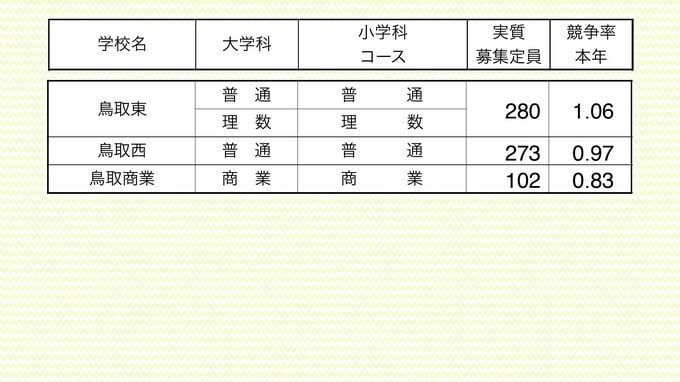 鳥取県公立高校入試2024 出願倍率(最終) 平均倍率0.87倍 最高は米子東高・生命科学コース1.65倍 鳥取湖陵高・情報科学科1.53倍