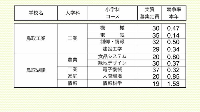 鳥取県公立高校入試2024 出願倍率(最終) 平均倍率0.87倍 最高は米子東高・生命科学コース1.65倍 鳥取湖陵高・情報科学科1.53倍