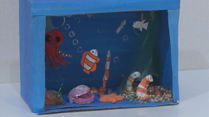 また、浜田市内の小学校の子どもたちは、絵だけでなく、工作や手芸作品なども数多く出品していて、思い思いに表現を楽しんでいる様子が伝わってきます。