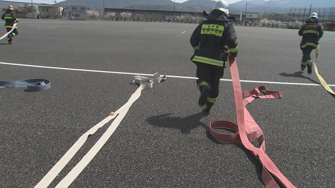 「65ミリのホース1本展張、収納にあっては、また2人組で連携とりながら実施してください。操作はじめ!」