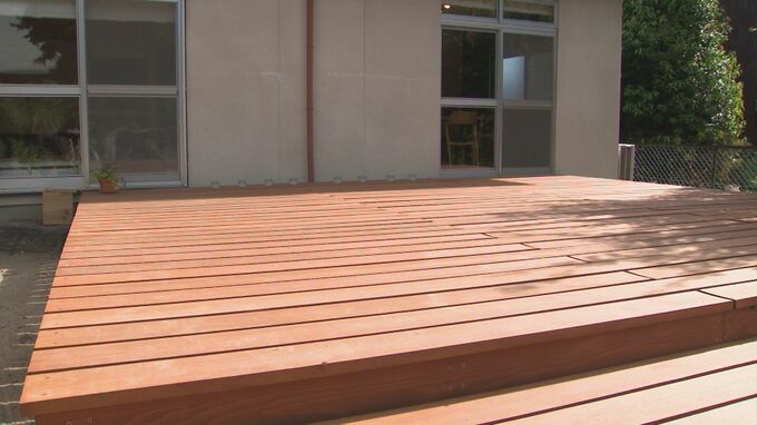 家族みんなで組み立てた広々としたウッドデッキができました。