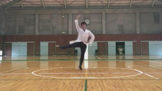 なぜか白衣姿で体育館の中を踊っている男性。