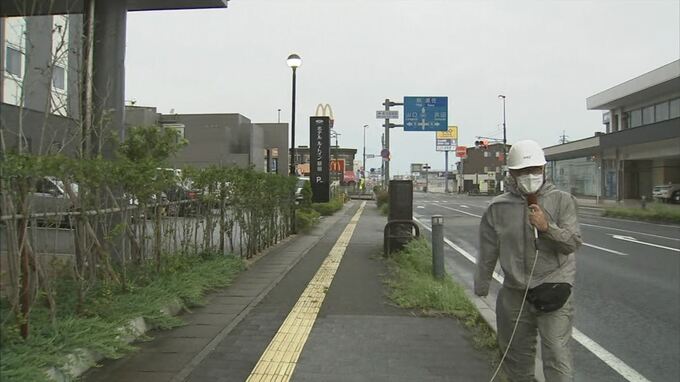 「午前6時の益田市です。3時くらいから風が強くなり、時々体が持っていかれそうです。改装中の店のシートがめくれあがっています」