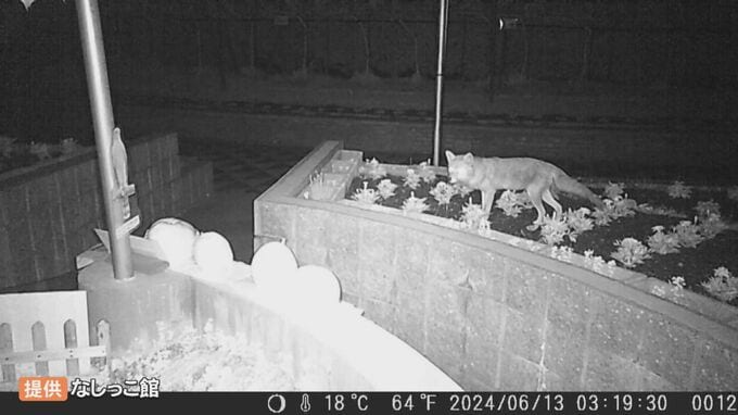 その8日後、今度はキツネがカメラに。ナシの方をチラチラ、かなり気になっているようです。真犯人はキツネなのか?しかし、結局食べることはありませんでした。