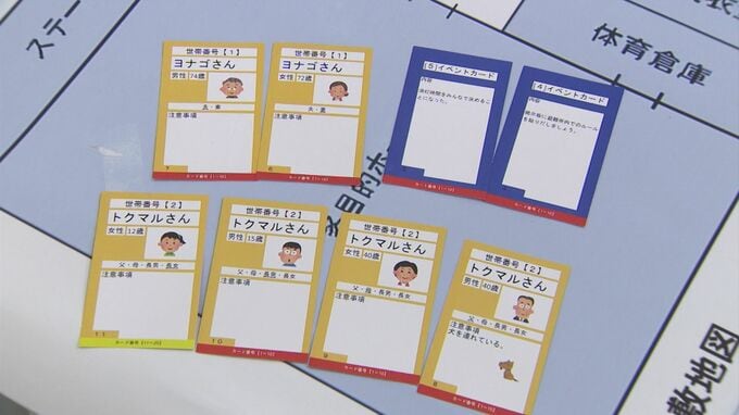ゲームで使うのは、避難所となる2階建ての公民館の平面図、そして、避難者の性別や年齢、抱える事情などが書かれたカードと避難所で起こる様々なイベントやトラブルが書かれたカードなどです。