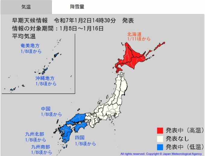 低温に関する早期天候情報は、四国、九州北部、九州南部・奄美、沖縄地方にも発表されています。
