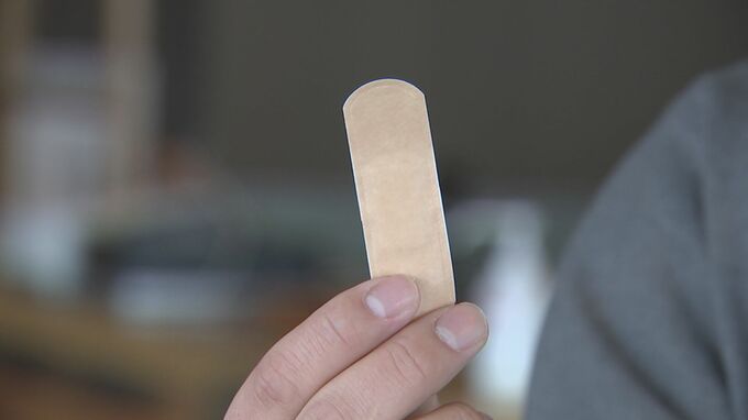 「このばんそうこうを靴の裏に貼ると滑らなくなるということで、やってみましょう」