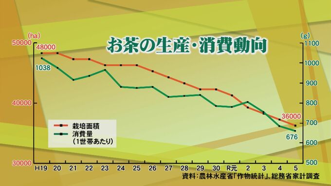 お茶の栽培面積、消費量は、ともに年々減少傾向。