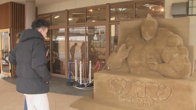 鳥取砂丘が闘いの舞台となり話題を集めているBSSで放送中のテレビアニメ「キン肉マン」。番組をさらに盛り上げようと、鳥取市の砂の美術館にキン肉マンの砂像が登場しました。