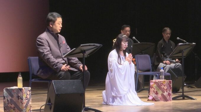 そこに人間国宝、大倉源次郎さんらが小鼓と笛、さらにピアノの演奏を載せることで、朗読と歌、和洋の調べが響き合う独特の舞台が繰り広げられました。