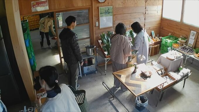 店内に並ぶ色とりどりの野菜を、客が次々と手にとっていきます。
