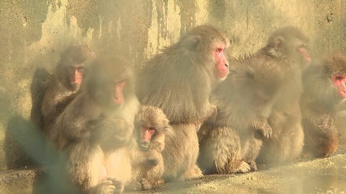 6日も米子市では雪が降り続き、湊山公園のサルたちは体を寄せ合って暖をとっていました。