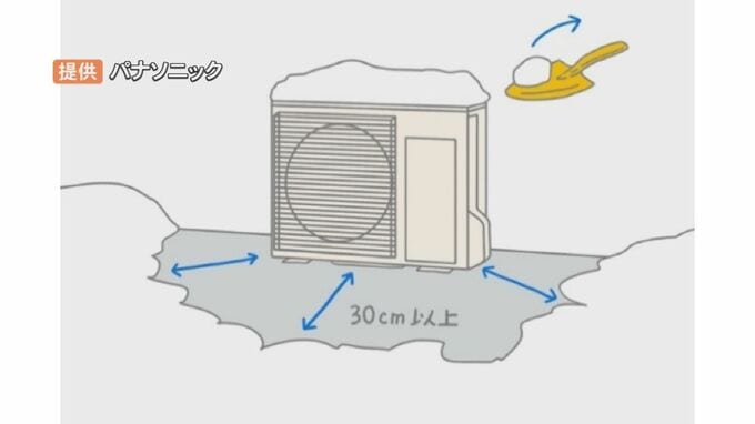 空気が通りにくくなることで、運転効率が低下してしまうこともあるため、側面や背面を含め30センチほど室外機の周りの雪を取り除いたり、外機の上に積もった雪も取り除いたりして、室外機の周りに雪が積もらないような対策が必要だということです。