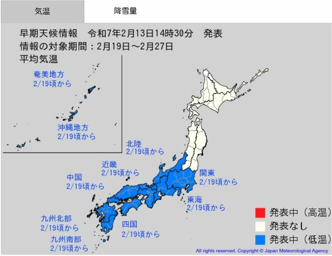 気象庁は13日、北海道と東北を除く広い範囲に「低温に関する早期天候情報」を発表しました。関東甲信、北陸、東海、近畿、中国、四国、九州北部、九州南部・奄美、沖縄では2月19日頃から、この時期としては10年に一度程度しか起きないような著しい低温になる可能性があるとしています。