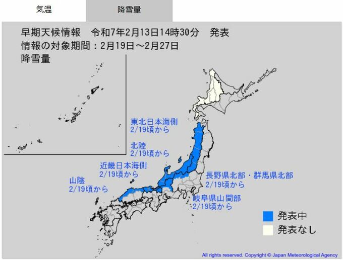 また、2月18日頃からは長野県北部・群馬県北部を中心に降雪量がかなり多くなる可能性があります。