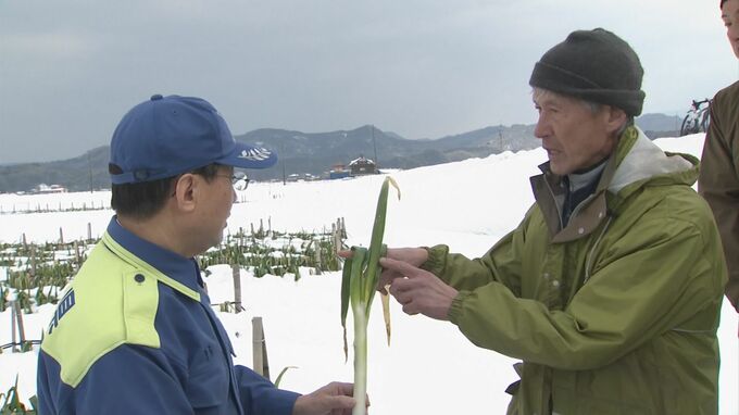 平井知事が視察したのは八頭町の田中農場。春ネギは30アールで栽培していますが、この3連休に雪が積もりました。