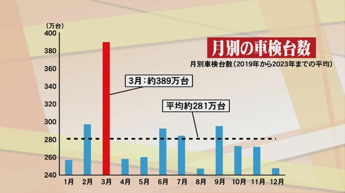 国土交通省の調べによると、月別の平均車検台数は約281万台なのに対し、最も多い3月は約389万台で、ほかの月に比べて飛び抜けて多くなっています。