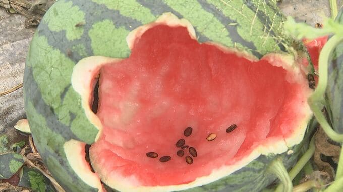 また、スイカの中の渇き具合から、犯人は一夜にしてではなく何日かにわたってスイカを食い荒らしたのではないかと推察されます。