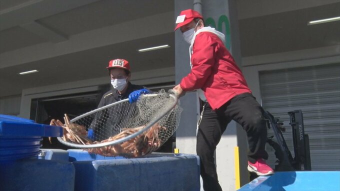 仲買人から仕入れた初物の松葉がには、なんと70杯。網を使ってトラックへとカニを移していきます。
