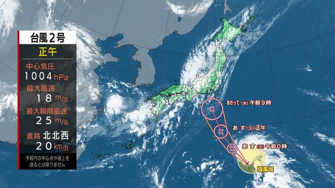 24日正午には父島の北北西約310キロの北緯29度35分、東経140度50分を中心とする半径95キロの円内に達する見込みです。中心の気圧は1004ヘクトパスカル、中心付近の最大風速は18メートル、最大瞬間風速は25メートルが予想されます。