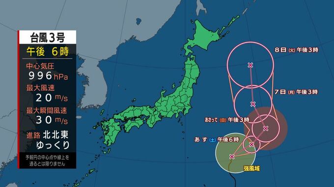 また、日本の東には「台風3号」があって、こちらは8日は熱帯低気圧へと変わる予想となっています。