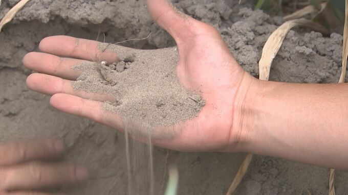 「この辺まで畝を上げたいよね。でも上げても崩れてしまう。本当はもうちょっと溝も深いんだけど、砂が崩れて浅くなっている」