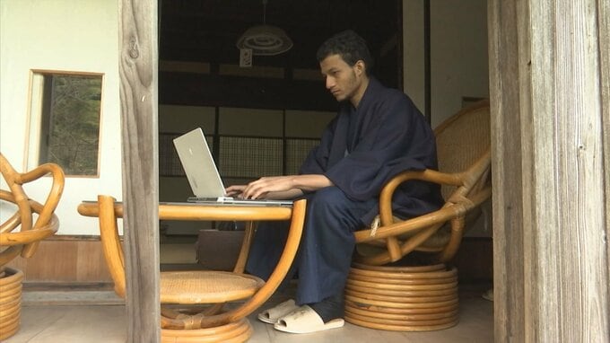 縁側でパソコンを叩く着物姿の男性が、その人です。