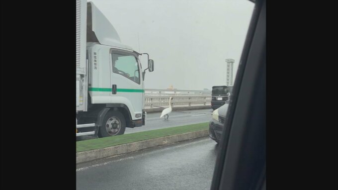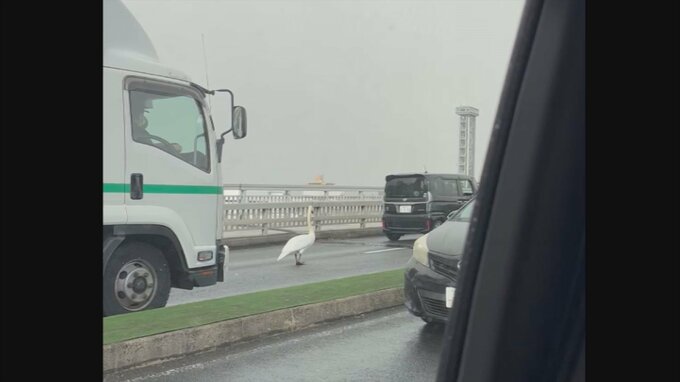 14日午前11時過ぎ、島根県松江市の「くにびき大橋」を大きなハクチョウが歩いている様子が、多くのドライバーに目撃されました。