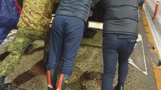 現場では、駆け付けた警察の要請で、滞留に巻き込まれた車両に乗っていた人らでトラックを押し、移動させようと試みる場面もありました。
