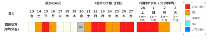 四国地方の向こう2週間の気温は、暖かい空気に覆われやすいため高い日が多く、2月22日頃と25日頃からはかなり高くなる見込みです。