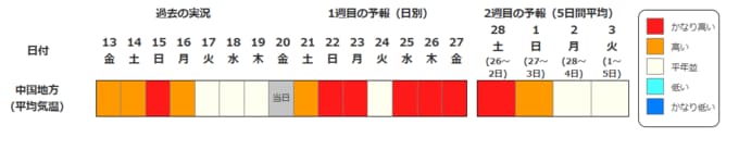中国地方の向こう2週間の気温は、暖かい空気に覆われやすいため高い日が多く、2月22日頃と25日頃からはかなり高くなる見込みです。