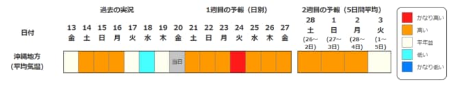 沖縄地方の向こう2週間の気温は、暖かい空気に覆われやすいため高い日が多く、2月25日頃からはかなり高くなる見込みです。