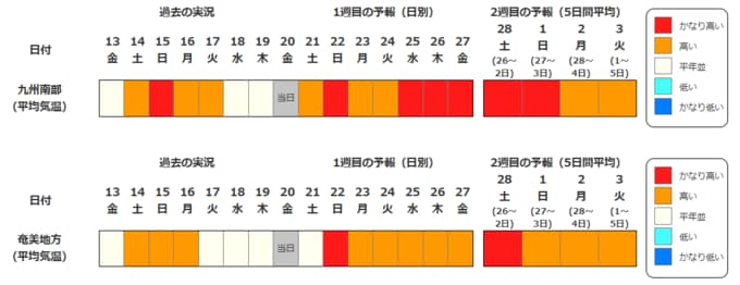 九州南部・奄美地方の向こう2週間の気温は、暖かい空気に覆われやすいため高い日が多く、2月22日頃と25日頃からはかなり高くなる見込みです。