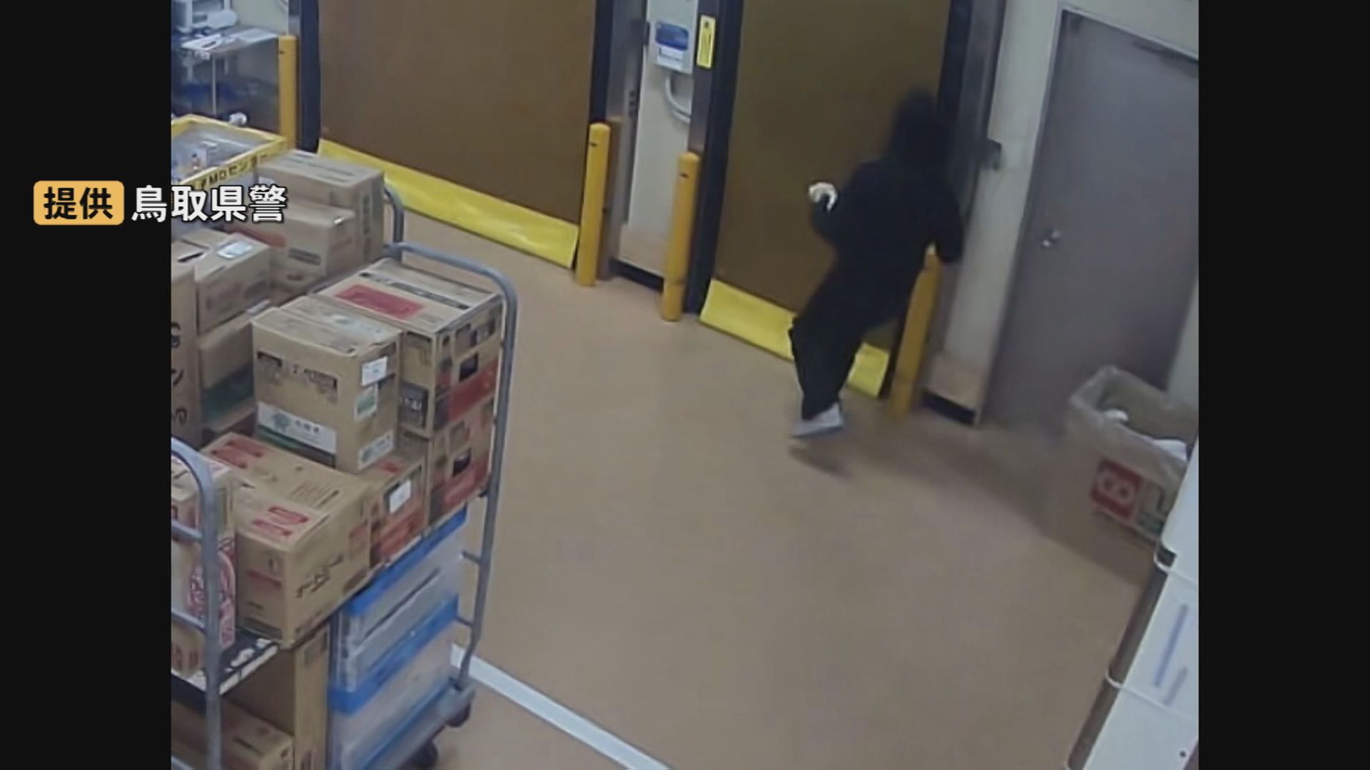 鳥取県警が公開した動画には、店の外から静かに入ってきた全身黒っぽい服の男が移っています。男はマスクをして、帽子とフードをかぶっているように見えます。