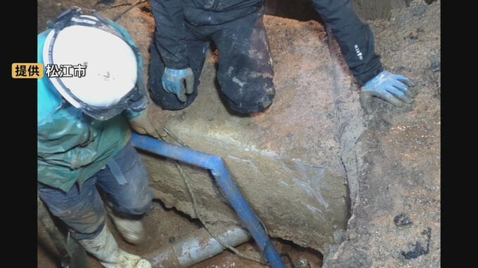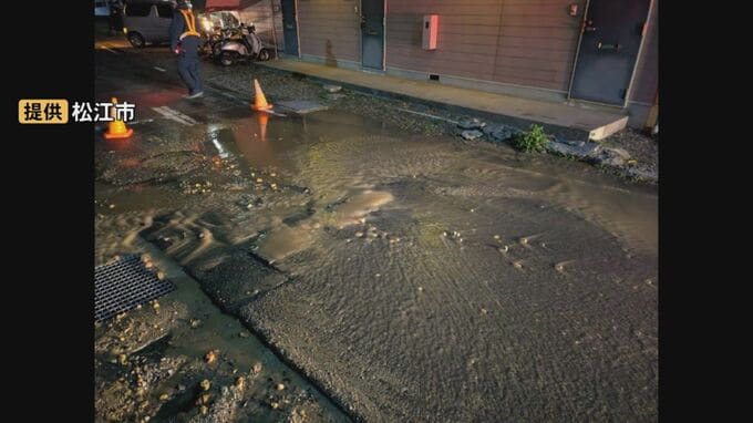 といった通報が松江市にあり、職員が現場に駆けつけたところ、道路から水があふれだし、直径1メートルほどの穴が開いていたということです。