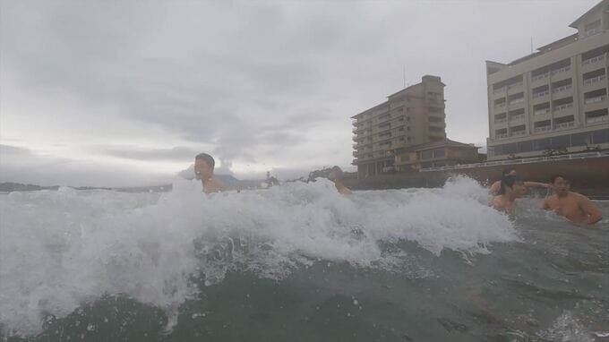 海から上がると待っていたのは、アツアツの大山どりの団子汁と仮設の温泉。
